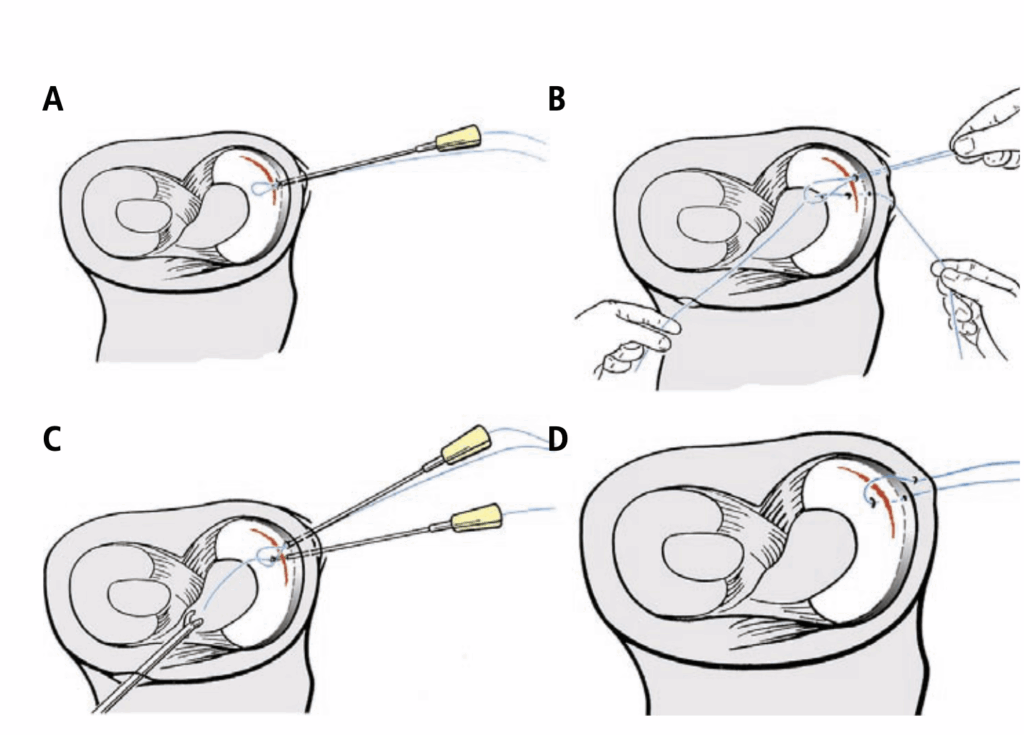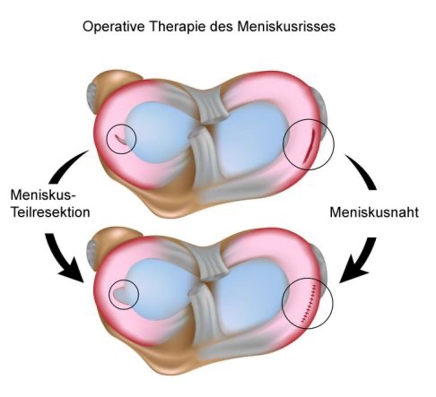 - επιδιόρθωση– συρραφή της ρήξης του μηνίσκου (μηνισκοσυρραφή) με τεχνικές Outside-In, Inside-Out, All-Inside και συνδυασμό αυτών